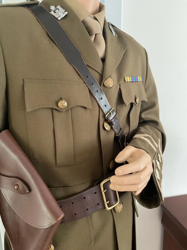 WW1 Officers leather Sam Brown belt which are ex theatre stock but were original officers belts. These are in fair to good condition and include a new reproduction leather Wembley revolver holster.